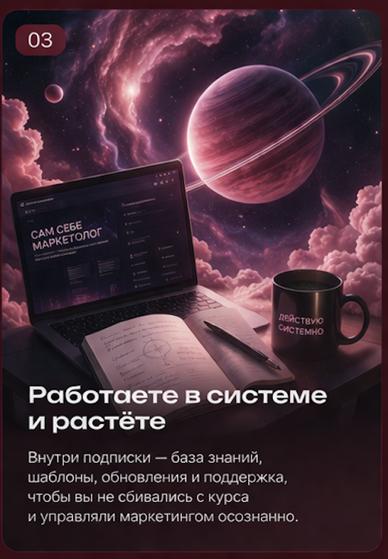 «Сам себе маркетолог» — это подписка для предпринимателей, которые устали действовать в маркетинге вслепую: вы начинаете с разбора своей ключевой проблемы, получаете стратегию, контент и понятную систему под свой бизнес, а дальше работаете с этим внутри подписки — с опорой, обновлениями и поддержкой, чтобы не просто “что-то делать”, а осознанно управлять своими продажами